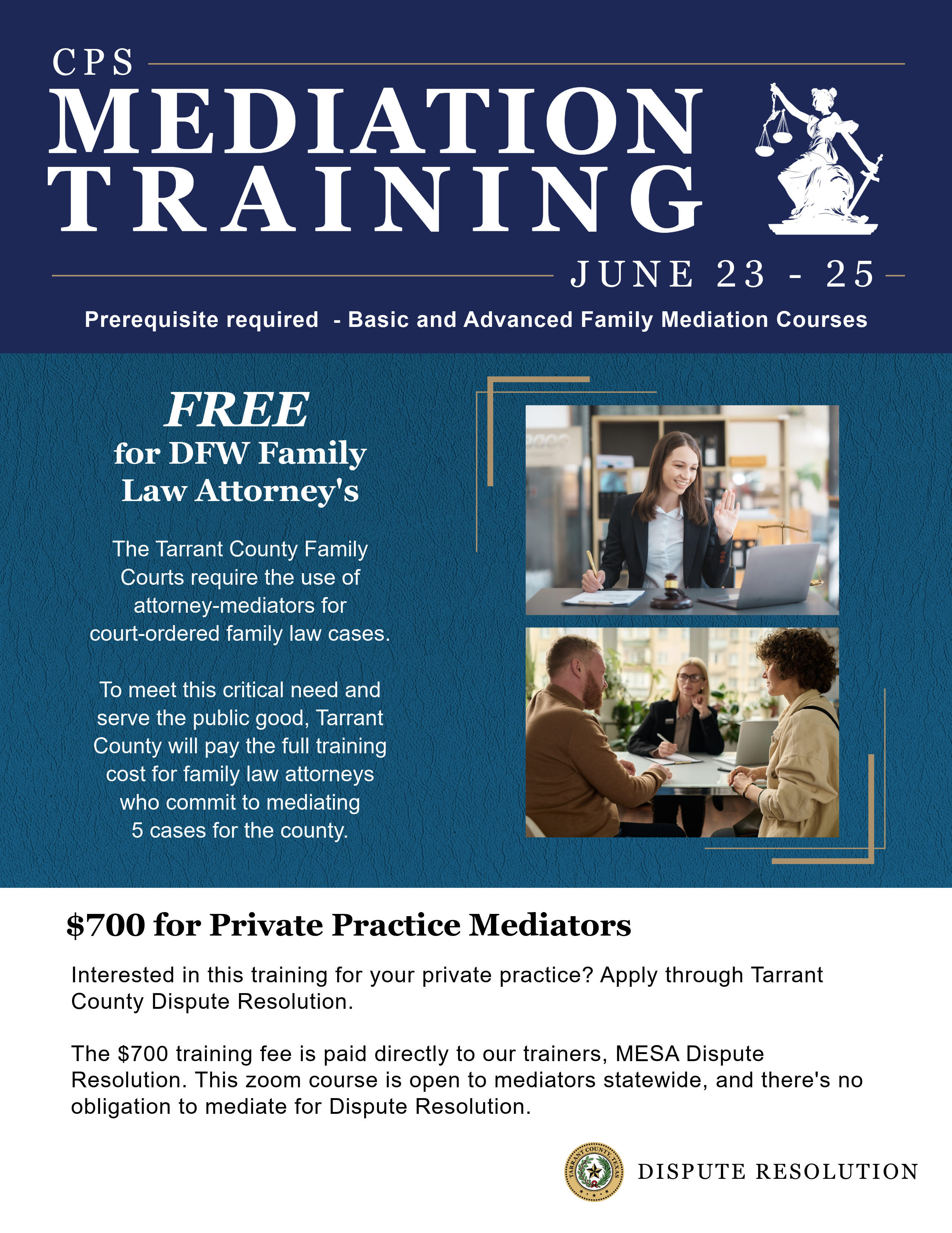 To mediate family cases for Tarrant County, you must also have successfully completed the 30-hour Advanced Family Mediation Training course.